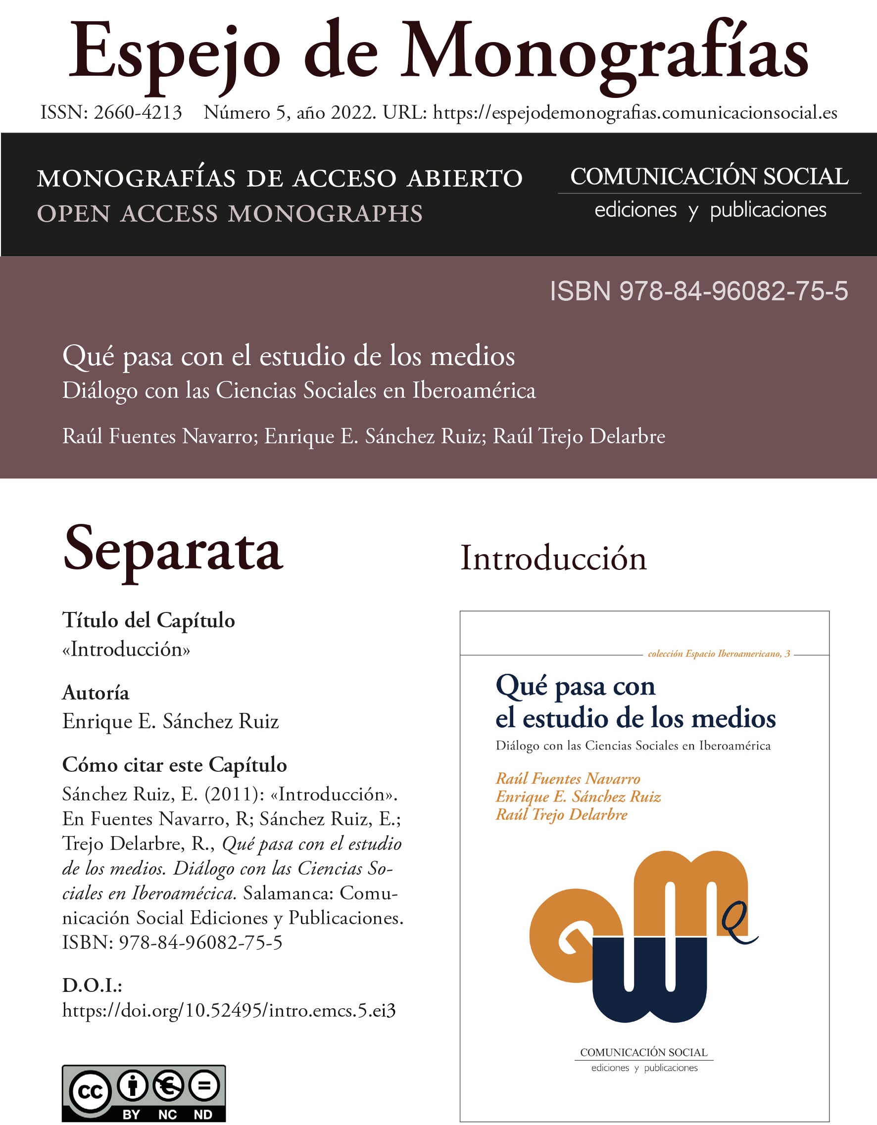 Separatas Digitales en Acceso Abierto (Open Access) de la monografía Qué pasa con el estudio de los medios. Diálogo con las Ciencias Sociales en Iberoamérica (2011), bajo la dirección académica de Raúl Fuentes Navarro, Enrique E. Sánchez Ruiz y Raúl Trejo Delarbre (coordinadores) publicada por Comunicación Social Ediciones y Publicaciones en su colección «Espacio Iberoamericano», en 2011.